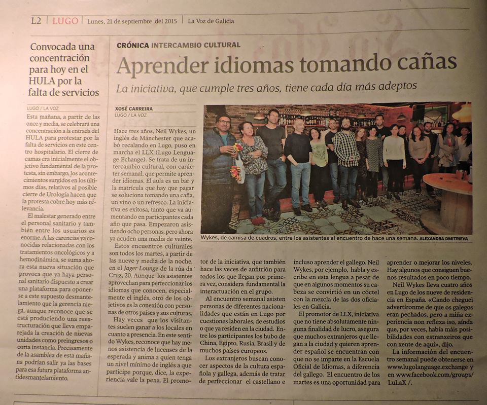 Cando regresei de Francia (hai case un ano), descubrín este encontro idiomático que se organiza cada martes no centro de Lugo. Dende entón convertiuse para min nun lugar e momento de referencia onde facer amigos, compartir vida, e compartir Lugo. Unha idea formidable (promovida polo inglés Neil Wykes) que xa ten tres anos de historia e que segue medrando semana a semana. Hoxe (21 de setembro do 2015) publicaron na Voz de Galicia este artigo sobre a historia do LLX, e aproveito para compartilo: “Aprender idiomas tomando cañas en Lugo”