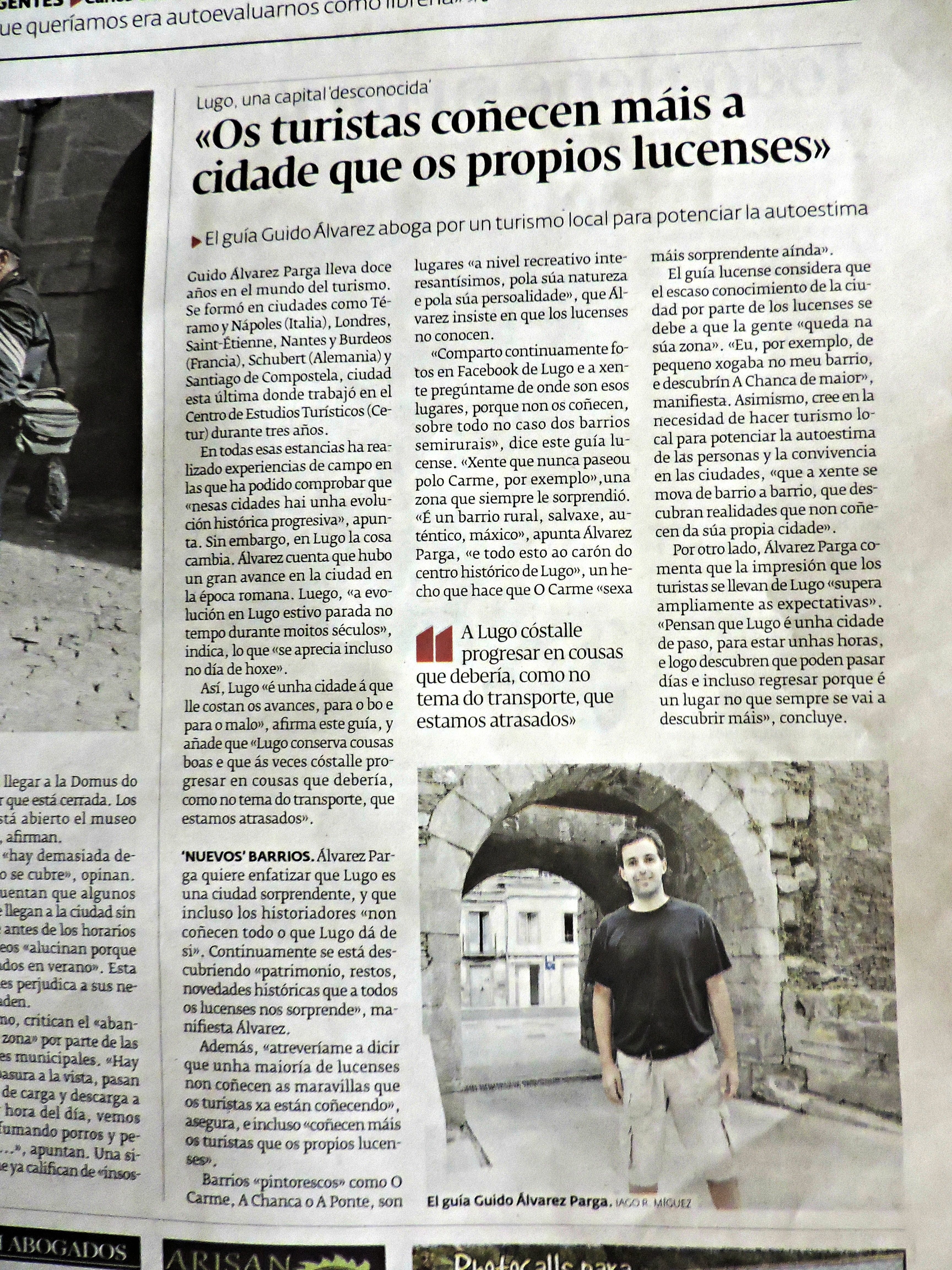 O guía lucense considera que o escaso coñecemento da cidade por parte dos lucenses débese a que a xente «queda na súa zona». «Eu, por exemplo, de pequeno xogaba no meu barrio, e descubrín A Chanca de maior», manifesta. Así mesmo, cree na necesidade de facer turismo local para potenciar a autoestima das persoas e a convivencia nas cidades, «que a xente se mova da barrio a barrio, que descubran realidades que non coñecen da súa propia cidade».