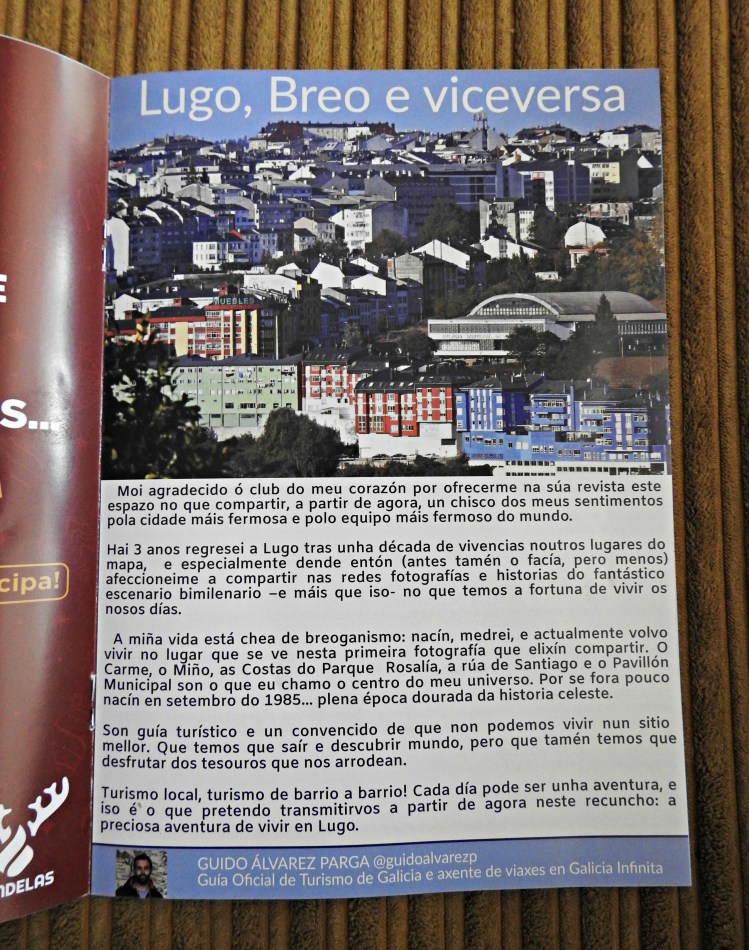 Onte foi un día moi especial: estreei unha sección de colaboración na revista do equipo da miña vida, o dos meus soños, o C.B. Breogán. Moi agradecido ó club, outra vez, por ofrecerme este oco con tanto valor! “Lugo, Breo e viceversa” comezou no nº 8 de “Fogar do Breogán”, no último partido de 2017, no derbi galego contra Básquet Coruña.