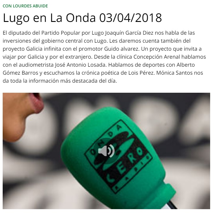 Podcast para escoitalo (dende o minuto 33): http://www.ondacero.es/emisoras/galicia/lugo/audios-podcast/lugo-en-la-onda-03042018_201804055ac5de4a0cf219c440fce6aa.html