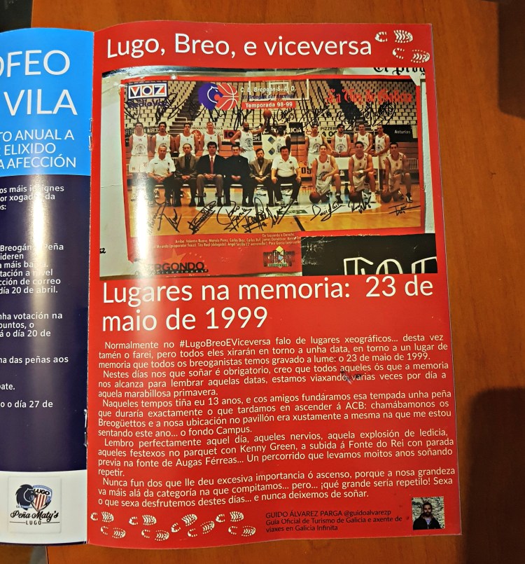 Normalmente no #LugoBreoEViceversa falo de lugares xeográficaos… desta vez tamén o farei, pero todos eles xirarán en torno a unha data, en torno a un lugar de memoria que todos os breoganistas temos gravado a lume: o 23 de maio de 1999.