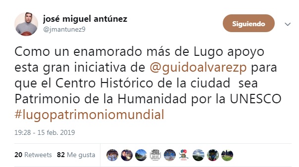 Alfonso Reyes, J.M. Antúnez, Fidel Fernán, Devin Wright, Rocío Varela, Javi Muñoz, Sergi e Erik Quintela ou Suso Lázare foron algunhas das primeiras personalidades lucenses ou de adopción en apoiar a candidatura de Lugo a Cidade Patrimonio da Humanidade UNESCO co hashtag #LugoPatrimonioMundial. Quenes serán os próximos en facelo? 🙂