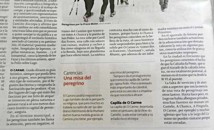 Hoxe unha reportaxe de Carmen Uz no diario El Progreso recolle algunhas impresións miñas, ou dos turistas/peregrinos ós que guío, sobre o Camiño Primitivo. En especial, sobre o desvío que a Axencia Galega de Turismo fixo hai uns anos no barrio do Carme: da ruta orixinal polo Regueiro das Hortas (enclave de inmensa riqueza natural e histórica, a rúa máis fermosa de Lugo, Camiño Primitivo, Vía Romana XIX, berce de San Froilán…) á rúa do Carme… moito menos atractiva, moito menos auténtica, e que por riba obriga ós peregrinos a cruzar a transitada Ronda do Carme.