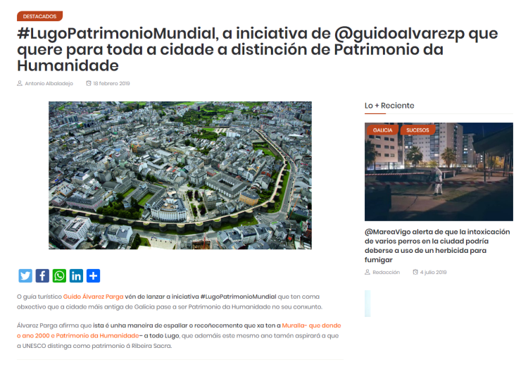 O guía turístico Guido Álvarez Parga vén de lanzar a iniciativa #LugoPatrimonioMundial que ten coma obxectivo que a cidade máis antiga de Galicia pase a ser Patrimonio da Humanidade no seu conxunto.