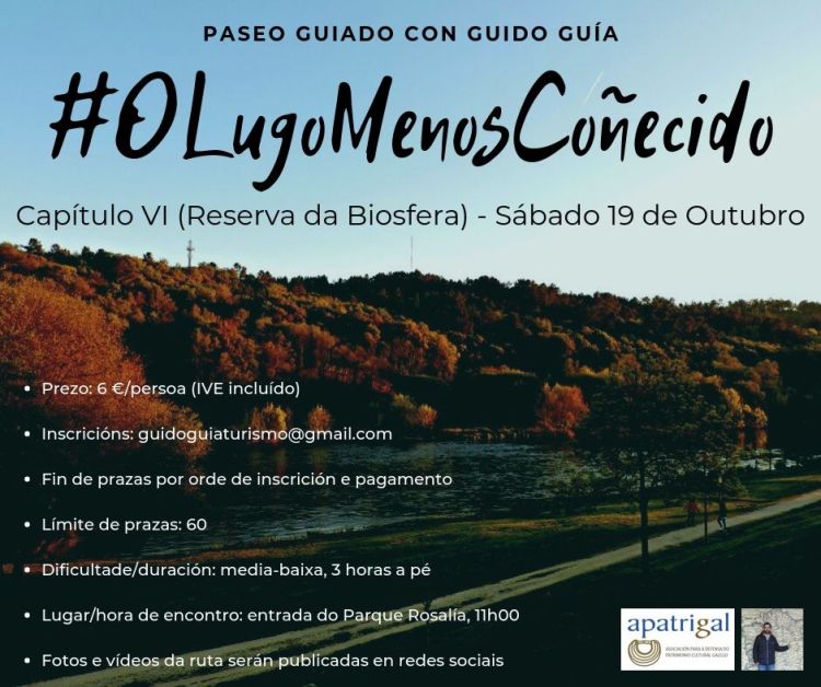 Cas inscricións dos cinco primeiros paseos en bo ritmo, chegou a hora de poñer en valor unha das maiores riquezas da cidade de Lugo: o feito de ser a única capital ibérica ubicada nunha Reserva da Biosfera UNESCO. Novamente apoiados pola Asociación para a defensa do Patrimonio Cultural Galego, lanzamos este VI Paseo guiado polo Lugo menos coñecido (Reserva da Biosfera) adicado á fabulosa biodiversidade lucense.