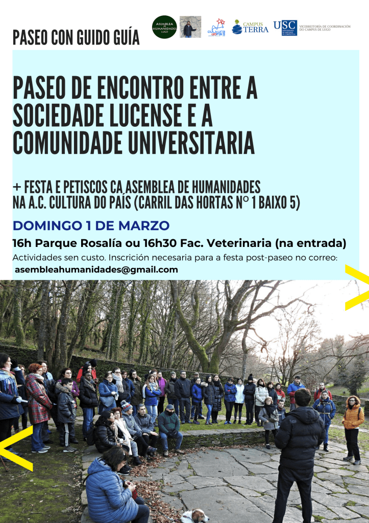 As actividades (tanto o paseo como a festa e petiscos) serán de balde… pero para ese post-paseo festivo será necesaria inscrición (por cuestións de aforo) a través do correo asembleahumanidades@gmail.com. Aproveitamos para darlle as grazas á A.c. Cultura Do País por cedernos o seu local, e ó Campus Terra USC e á Vicerreitoría de Coordinación do Campus de Lugo polo seu apoio! Vémonos o 1 de marzo ás 16h00 no Parque Rosalía ou ás 16h30 na entrada da Facultade de Veterinaria 🙂❤🍃💧 Traede roupa e calzado cómodos, e moitas ganas de pasalo en grande!