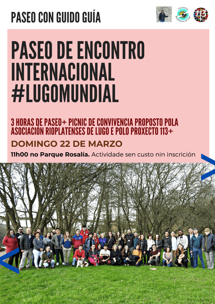 Despois do exitazo de onte unindo á sociedade lucense e á comunidade universitaria, non deixamos nin un intre de agarda para anunciar este outro gran evento de encontro… desta volta do #LugoMundial! 🌏 Conseguiremos compartir #OLugoMenosCoñecido cas 113 nacionalidades que se rexistran en Lugo? Bo momento para darlle visibilidade a este marabilloso proxecto #113Máis (apoiado pola Rede Museística Provincial de Lugo e a Deputación de Lugo) ❤ co picnic post-paseo que organizaremos con eles e ca Asociación Rioplatenses de Lugo!