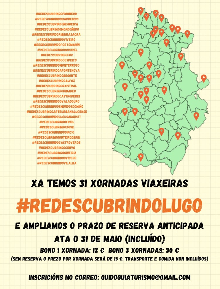 Dúas semanas despois de lanzar o proxecto de xornadas viaxeiras #RedescubrindoLugo, sumamos 11 novos destinos e unha chea de colaboradores entre os cales hai moitos concellos, asociacións, profesionais e institucións! Ademais de máis de 50 reservas 😍 Iso é confianza! 💙 Moi pronto contarémosvos máis detalles, pero polo de agora vai a novidade: ampliamos plazo de reserva anticipada ata o 31 de maio! ✨✨✨