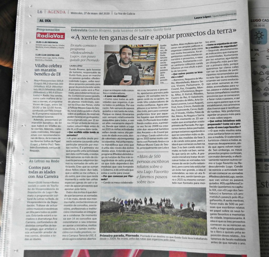 Guido Álvarez, guía lucense de turismo, responsable de Guido Guía, puxo en marcha os paseos guiados «Redescubrindo Lugo», unha novidosa proposta pensada para gozar da provincia este verán. A primeira saída será a Piornedo, previsiblemente en xuño. Contará con paseo guiado, actividade de identificación de plantas medicinais, xantar no Chao das Penas, visita á Palloza-Museo Casa do Sesto, nova visita guiada e charla sobre as pallozas. As reservas poden facerse en guidoguiaturismo@gmail.com, por 13 euros (30 por un bono de tres xornadas) adquiríndoas antes do día 31, e 15 euros máis tarde.