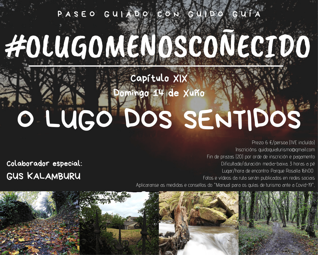 Se queredes inscribirvos ou informarvos, podedes facelo a través do correo guidoguiaturismo@gmail.com. O prezo deste paseo é de 6 € por persoa (IVE incluído). Fotos e vídeos da experiencia serán compartidos co fin de dala a coñecer para vindeiros capítulos… grazas coma sempre á Asociación para a defensa do Patrimonio Cultural Galego polo seu apoio! #OLugoDosSentidos
