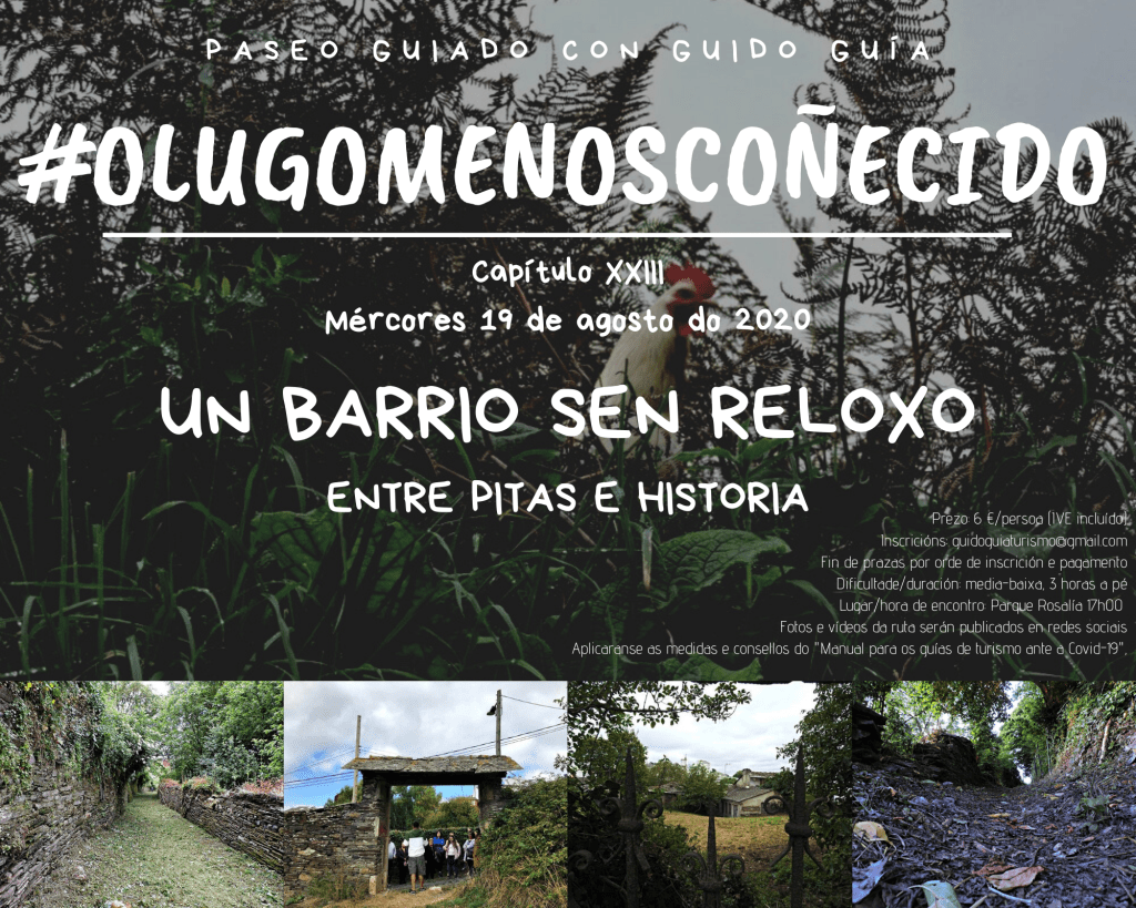 Se queredes inscribirvos ou informarvos, podedes facelo a través do correo guidoguiaturismo@gmail.com. O prezo deste paseo é de 6 € por persoa (IVE incluído). Fotos e vídeos da experiencia serán compartidos co fin de dala a coñecer para vindeiros capítulos… grazas coma sempre á Asociación para a defensa do Patrimonio Cultural Galego polo seu apoio!