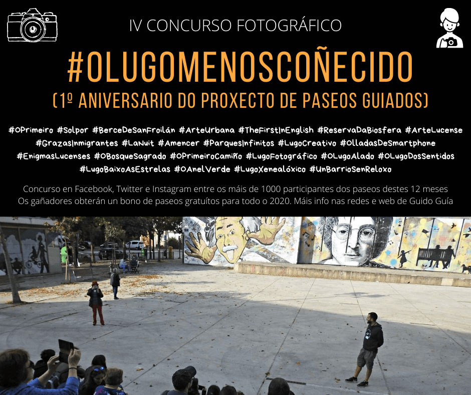 O 14 de setembro o proxecto de paseos guiados #OLugoMenosCoñecido cumprirá un ano de historia, e queremos festexalo 🥳 Como? Cun novo concurso fotográfico, desta vez orientado a facer memoria de todo o vivido nestes 12 meses. Cal foi o teu capítulo favorito dos 23 que levamos? Elixe unha foto del, titúlaa, e cóntanos algo sobre ese día 🙂❤️ Cada participante poderá participar cunha soa foto do seguinte xeito: