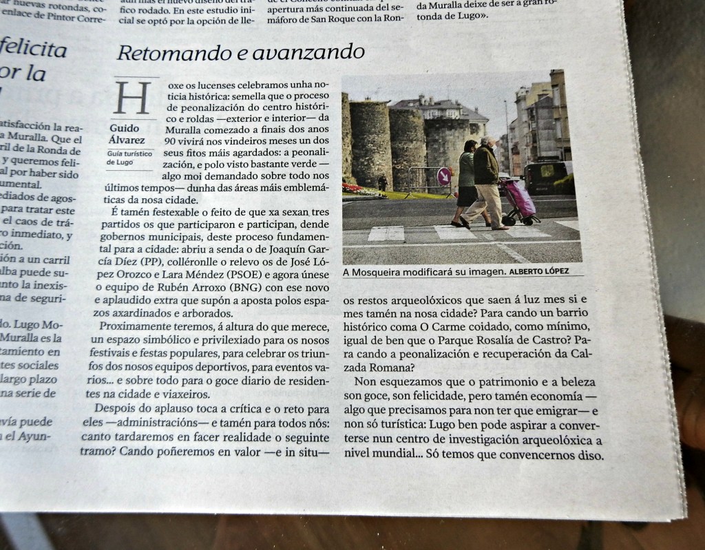 Despois do aplauso toca a crítica e o reto para eles -administracións- e tamén para todos nós: canto tardaremos en facer realidade o seguinte tramo? Cando poñeremos en valor -e in situ- os restos arqueolóxicos que saen á luz mes si e mes tamén na nosa cidade? Para cando un barrio histórico coma O Carme coidado, como mínimo, igual de ben que o Parque Rosalía? Para cando a peonalización e recuperación da Calzada Romana? Non esquezamos que o patrimonio e a beleza son goce, son felicidade, pero tamén economía -algo que precisamos para non ter que emigrar- e non só turística: Lugo ben pode aspirar a converterse nun centro de investigación arqueolóxica a nivel mundial… Só temos que convencernos delo.