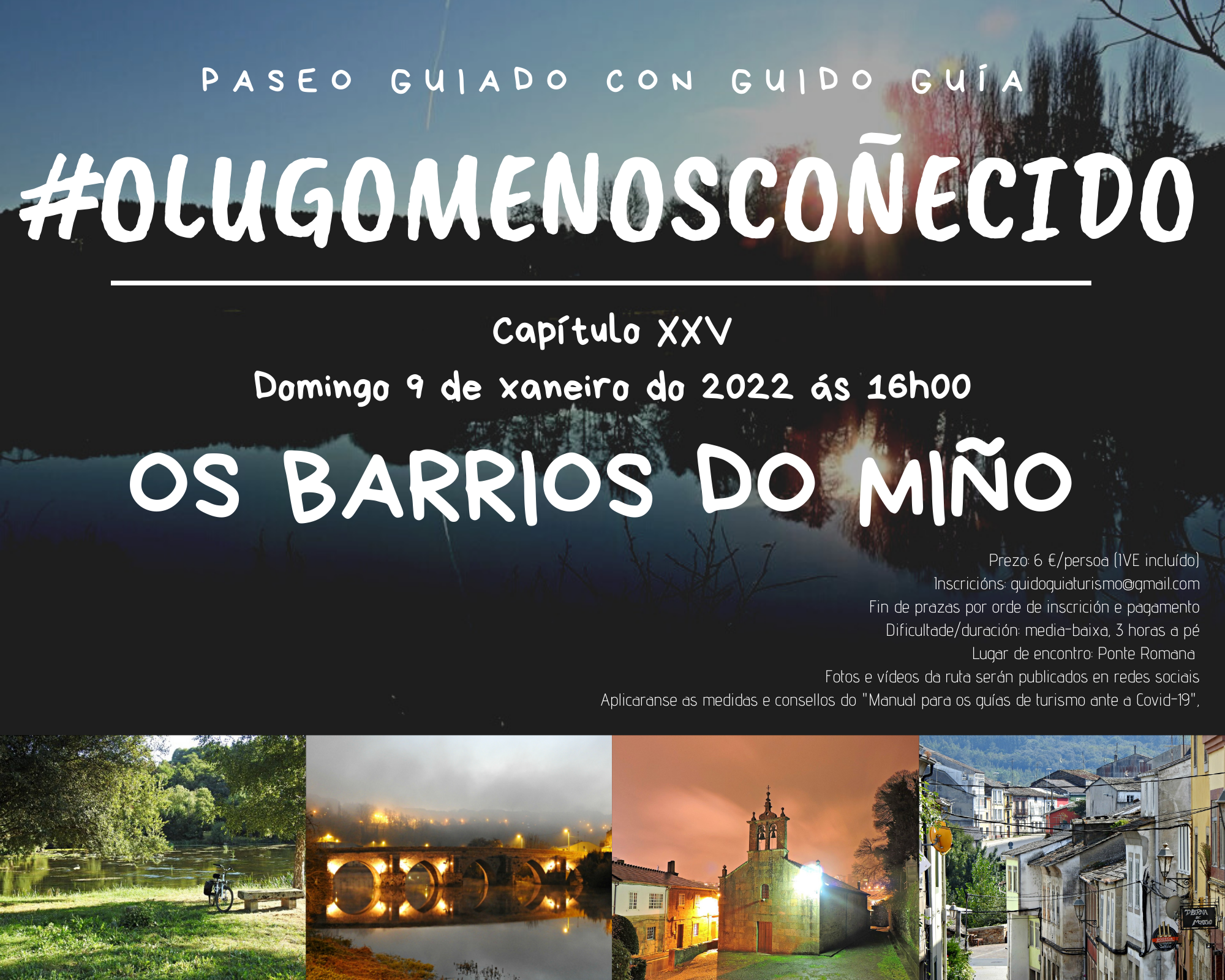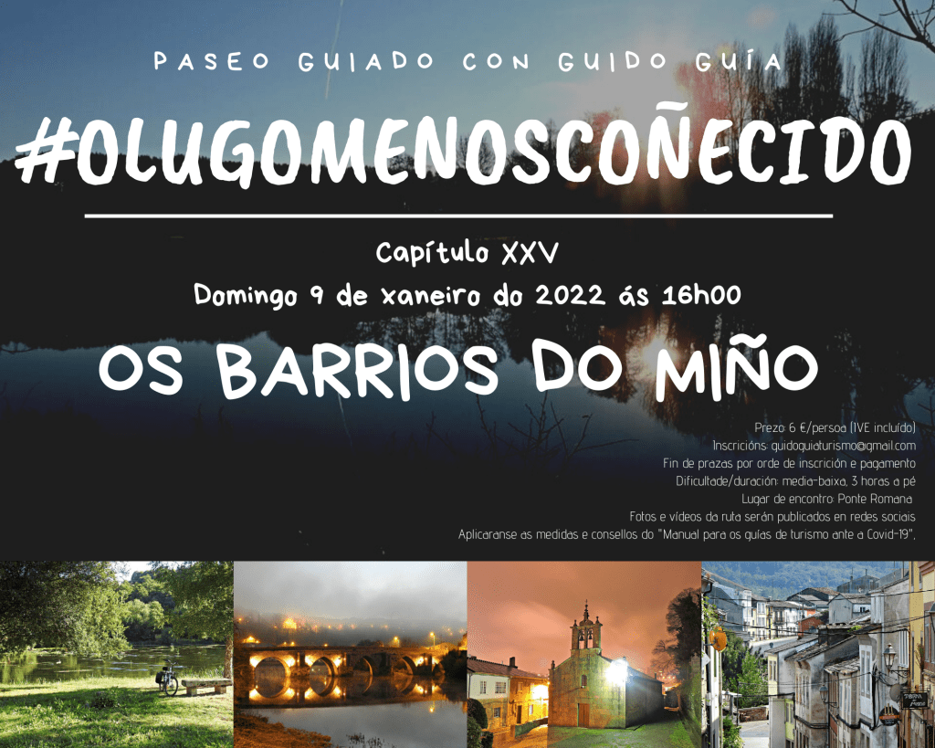 Ola! Comeza con forza o 2022 e xa nos preparamos para o noso primeiro paseo guiado do ano ❤ Estreamos capítulo, o XXV, da serie #OLugoMenosCoñecido! Agardamos que a primeira edición de moitas… animádevos a descubrir #OsBarriosDoMiño? 💧🦆 Inscricións en guidoguiaturismo@gmail.com 🙂