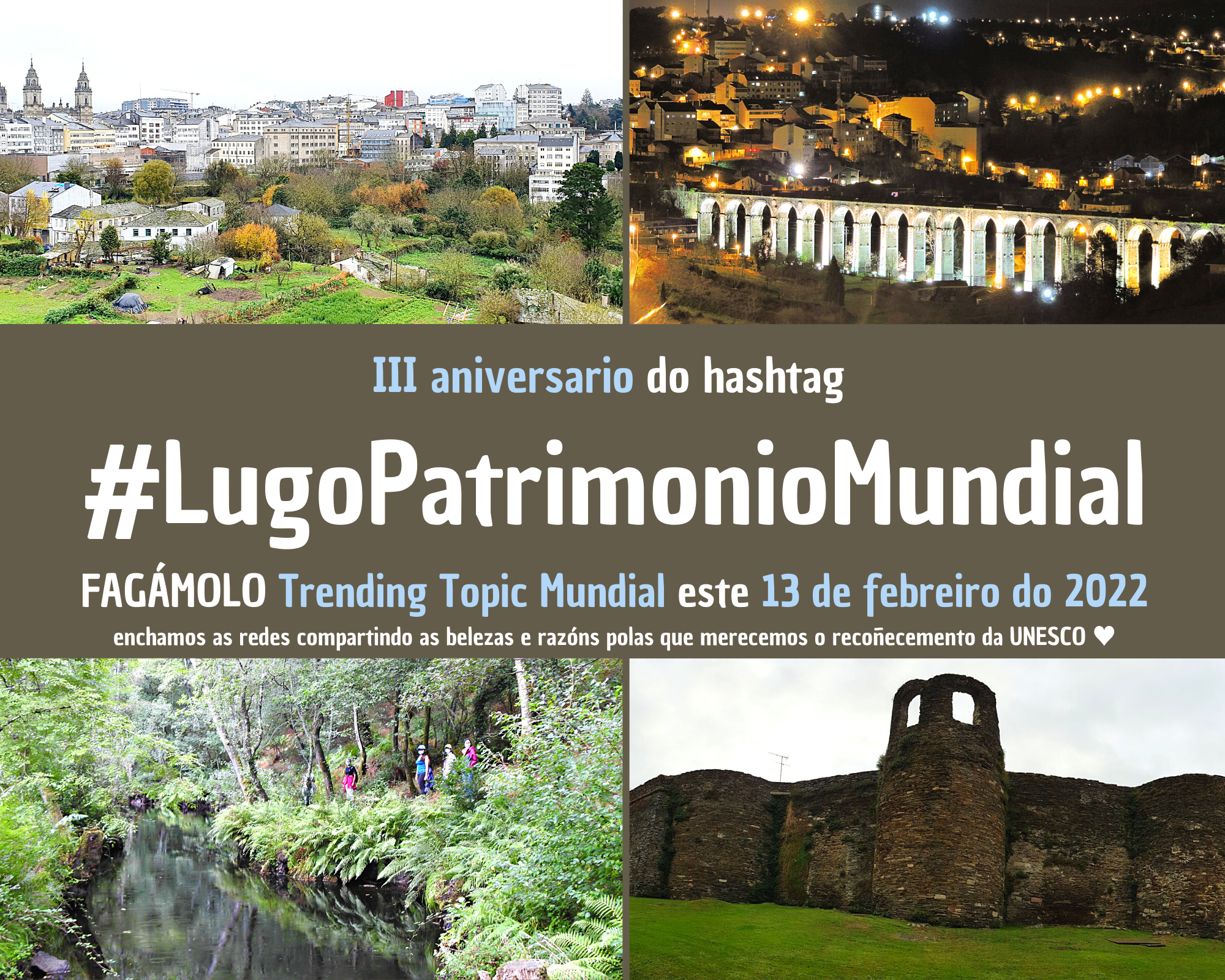 Lembrade que o vindeiro 13 de febreiro celebramos o 3º aniversario do hashtag #LugoPatrimonioMundial e un ano máis tentaremos levalo ao máis alto! No 1º TT estatal, no 2º TT europeo… e no 3º? Ide quencendo motores ![]()
