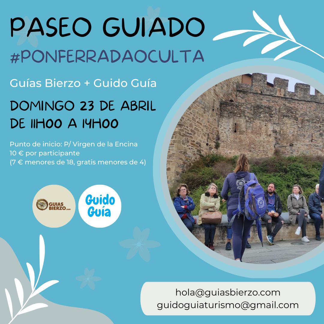 O paseo guiado #PonferradaOculta será o domingo 23 de abril de 11h00 a 14h00 e con punto de inicio na Praza Virgen de la Encina. As inscricións poden realizarse por correo electrónico a través de hola@guiasbierzo.com e guidoguiaturismo@gmail.com