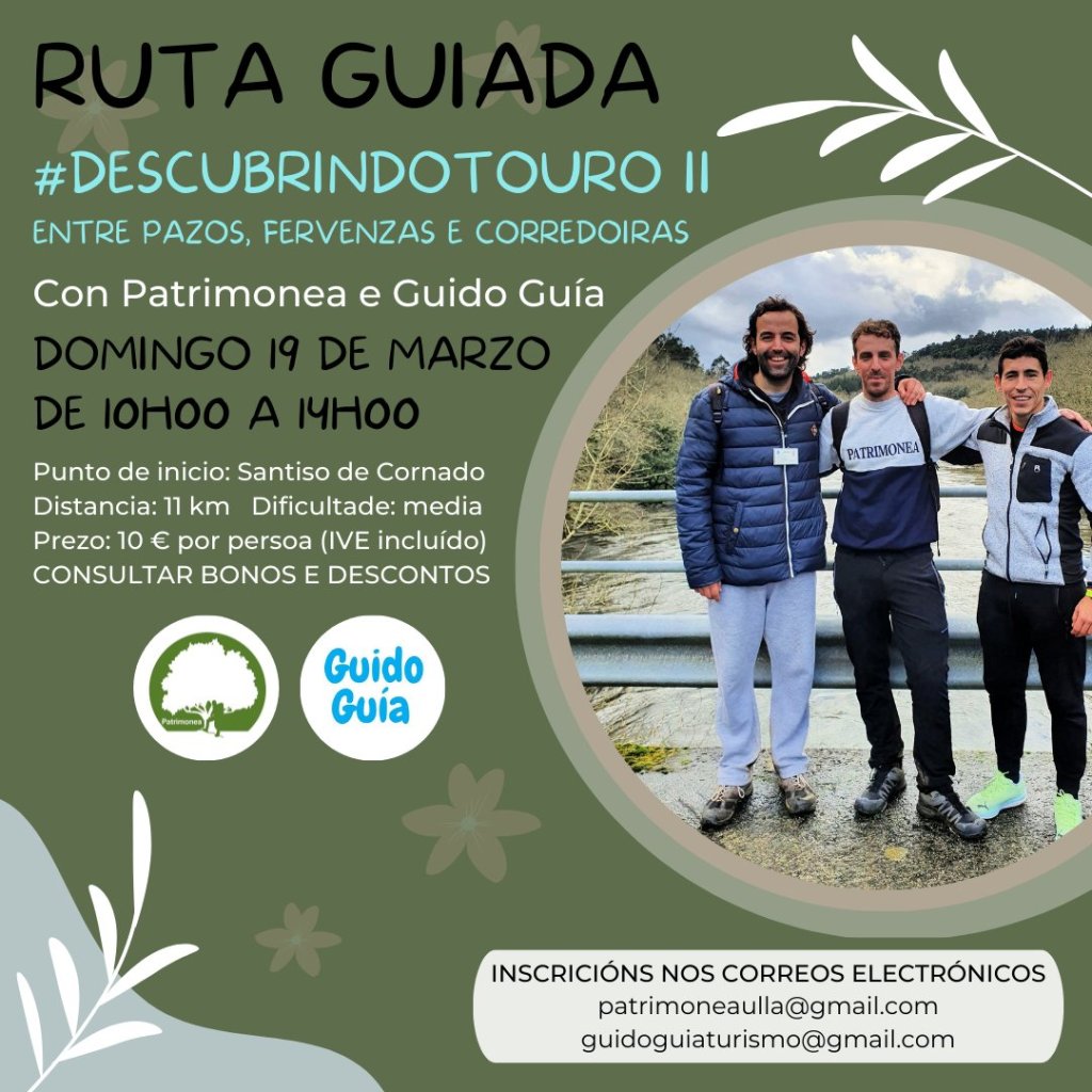 O domingo 19 de marzo Patrimonea e Guido Guía organizan un roteiro na localidade de Touro co obxectivo de dar a coñecer un dos bosques de ribeira mellor conservados de Galicia xunto a un extenso patrimonio material e inmaterial. O itinerario será duns 11 quilómetros de dificultade baixa-media e será diferente ao anterior que foi organizado no mes de xaneiro.