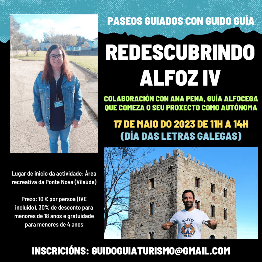 Vendo como voan as inscricións dos vindeiros paseos guiados, e tendo unha noticia tan boa como o inicio do proxecto como autónoma da guía alfocega Ana Pena, lanzamos nova actividade para o mes de maio: #RedescubrindoAlfoz IV